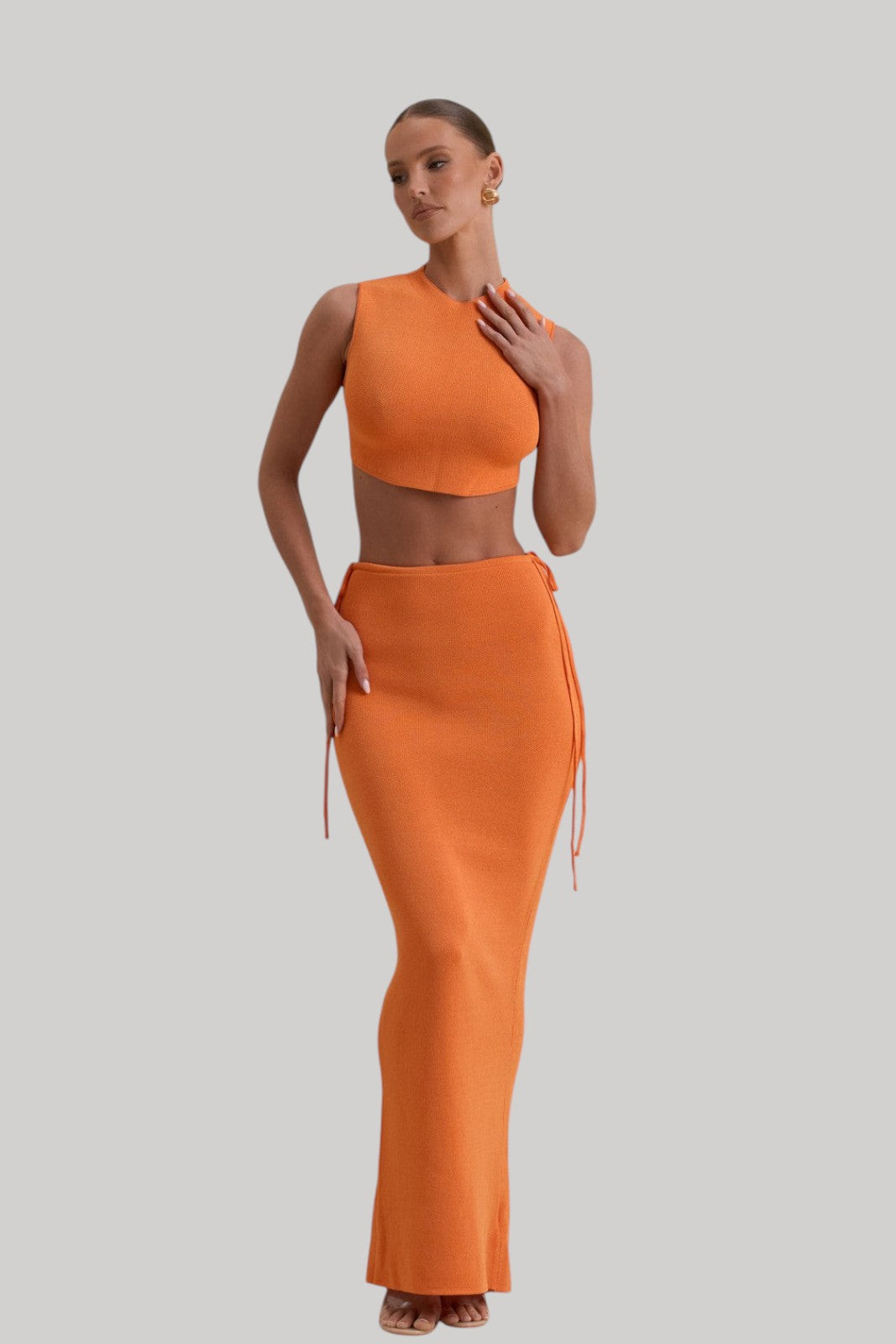 El Vestido Granada combina sofisticación y carácter en un vibrante tono naranja. Con un top de espalda abierta y lazada ajustable, junto a una falda maxi de corte elegante y abertura trasera, es la elección perfecta para tus noches especiales.